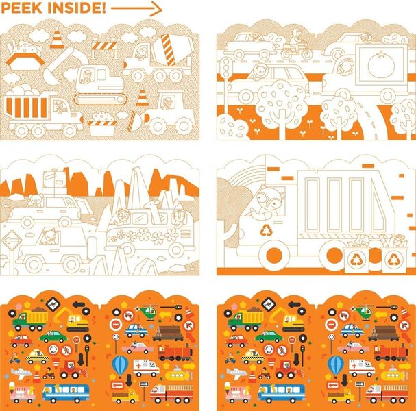 Izkrāsojamas lappuses ar dažādiem transporta līdzekļiem, turklāt papildu vēl vairāk kā 100 tematiskās uzlīmes, ar ko papildināt zīmējumus.