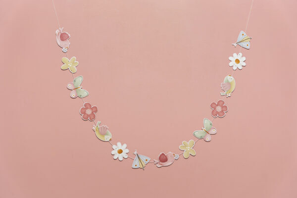 Apskati visus šos mīļos tēlus! Seko šai burvīgajai rindai ar putniņiem, tauriņiem un ziediem — kādi piedzīvojumi jūs sagaida? Šī kartona dekora virtene iedvesmos bērna iztēli, kad vakaros stāstīsiet pasakas par maģisku dārzu, kur aug visskaistākie ziedi un lido viskrāšņākie tauriņi un putniņi. Piekarini to pie sienas, pāri aizkariem vai gar grāmatplauktu, l